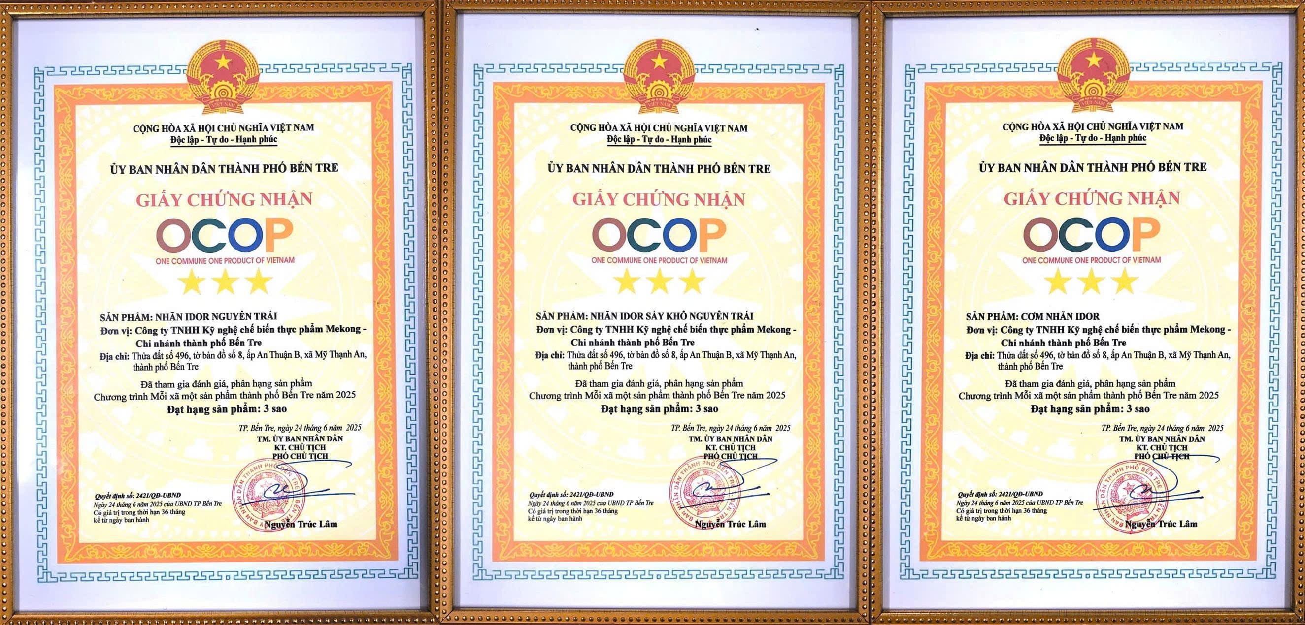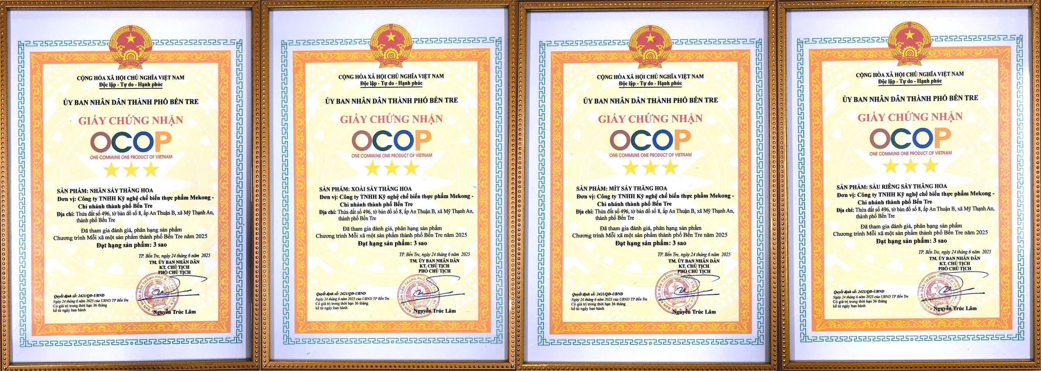 Ngày 30/6/2025, đại diện UBND TP. Bến Tre đã đến thăm và tổ chức lễ trao 7 giấy chứng nhận sản phẩm OCOP đạt chuẩn 3 sao cho Công ty TNHH Kỹ nghệ Chế biến Thực phẩm Mekong, ghi nhận nỗ lực của công ty trong phát triển và chế biến nông sản địa phương theo hướng hiện đại, an toàn và bền vững.